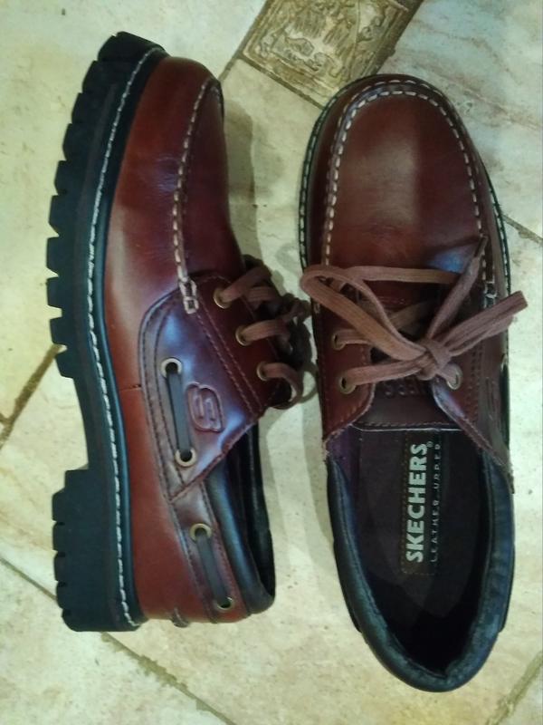 туфлі потужні на вигляд і вага. бордовий колір. прострочені все. по боках просмикнута шкіряний шнурок. зверху в задній частині окантовка місцями облізла до тканини ( це доречі хвороба багатьох інших фірм і брендів коли її обшивають кожзаменителями. взуття як нова. а ця обшивка вже обтерлась...) я так розумію що це високоякісний замінник шкіри так називається. але сам ношу і носив замінники .та іноді не менше ніж з шкіри. та й всі кросівки зроблені також з замінників до речі. розмір на бірці 42.устілка -27 див.