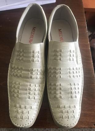 Туфлі натуральна шкіра.одягалися на весілля -на урочисту частину .сліди шкарпетки тільки на підошві небагато .розмір повний 43. Устілка 30 см-але вузький носок .якщо нога дуже вузька то і на 44 пройде.купувалися за 150 доларів. колір "шкаралупа"