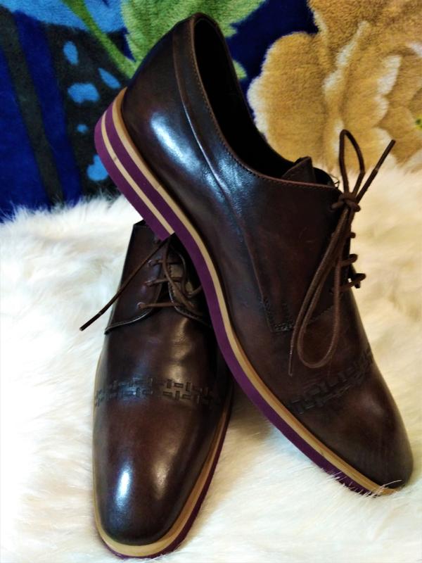 Натуральна високоякісна шкіра, посилений носок і задник, красивий колір, безкомпромісна якість, пр-во Румунія. Класичний стиль не виходить з моди. Звертаю Вашу увагу, що носок взуття вузьке, тому стопа не увійде повністю від краю до краю, думаю сантиметра 2 потрібно врахувати. Ідеально все ж на вузьку або середню стопу. Колір коричневий з бордовим відтінком. Довжина устілки 28 см мінус вузький носок !!! Моя думка, підійдуть максимум на 27 см. Взуття шикарне. Всім вдалих покупок. 0021
