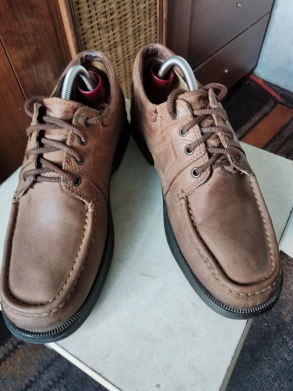 Светло- коричневые туфли из натурального материала /нубук/, очень крепкие, на кожаной подкладке. Прочная и надёжная подошва. Качество во всем. Размер указан 8, длина стельки 27 см.
