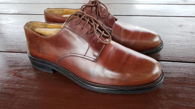 Туфлі Russell Bromley Burford. Дербі, зроблені в класичному стилі. Розмір 44. Устілка - 29 див. Туфлі з заокругленим носком з коричневої шкіри теляти. Підошва - Dainite. Туфлі прошиті за методом goodyear welt. Верх - шкіра, підкладка - шкіра. Стан добрий.