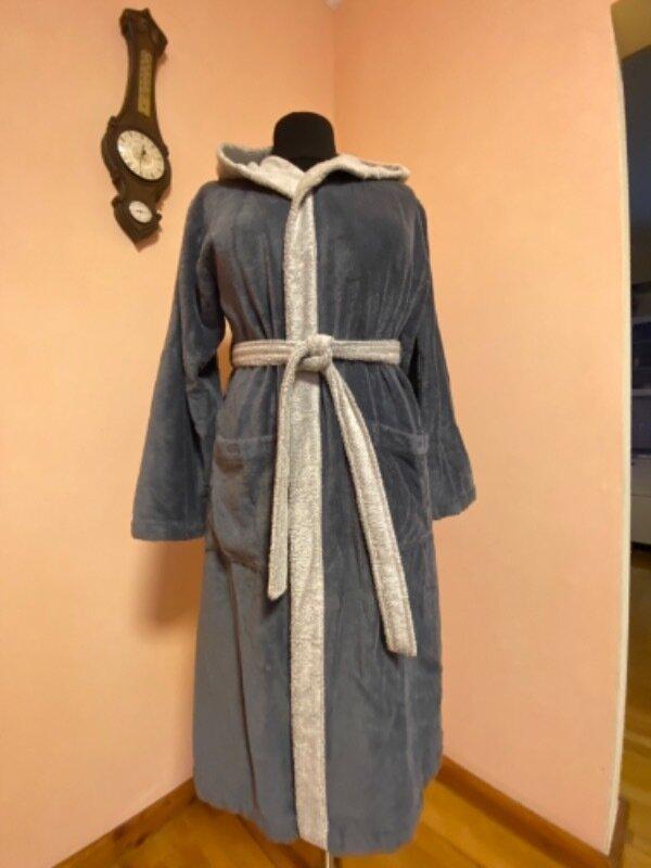 Махровый мягкий халат унисекс, размер М указано, демонстрировано на манекене 52 размера. Сверху велюр внутри махра. Дорога вещь. Длина - 112см, плечи - 50см, рукав от плеча - 60см, пог- 60см, мерцание по спинке, до низа прямой.