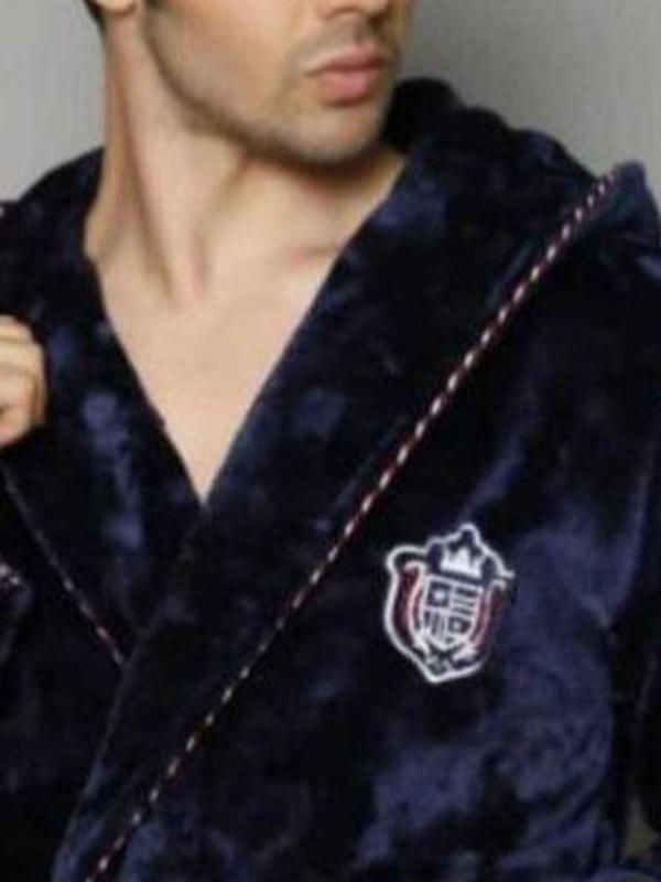 Красиві темно синього кольору чоловічий халат. Відмінної якості щільний оксамитовий трикотаж дуже комфортно зігріває тіло. По краю коміра халата гарний джгут елегантно підкреслює його лінію. На грудях красива вишивка логотип. п.24