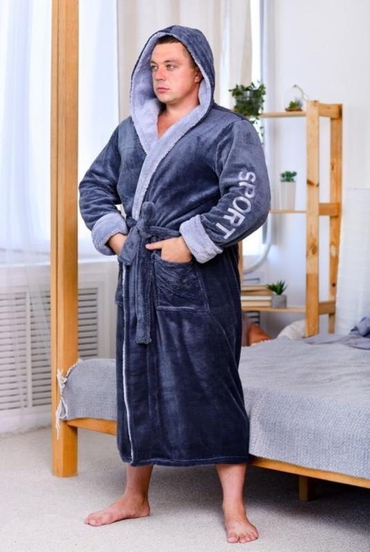 Сірий теплий довгий махровий/плюш халат з капюшоном на запах s-6xl. є кольори