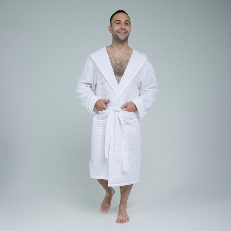 Вафельний халат на запах, з поясом і кишенями. На вибір з капюшоном або без. Завдяки вільному крою та м'якому матеріалу халат не сковує рухів і дарує відчуття комфорту. Вафельна тканина із 100% бавовни. Легка та приємна на дотик, швидко вбирає вологу і сохне. Вафельний халат стійкий до зношування та деформації, тому прослужить вам довгі роки. Рекомендуємо прати при температурі не більше 40 градусів. Щоб зберегти м'якість халата, не використовуйте агресивні миючі засоби.