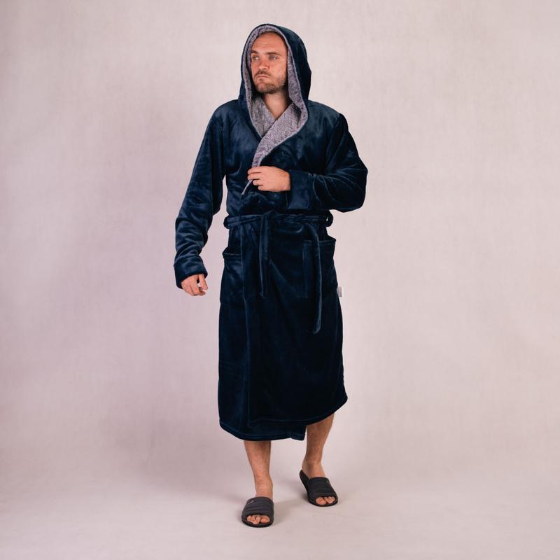 Чоловічий халат на запах з подвійним капюшоном, полотно Вельсофт-махра. Халат йде з кишенями і так само в комплекті йде пояс. Розмірний ряд 44-46, 48-50, 52-54, 56-58 На фото модель в 48 ом розмірі. В наявності кольори: чорний та синій.