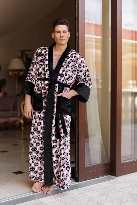 Махровый теплый мужской домашний длинный леопардовый халат с карманами ткань полированная...