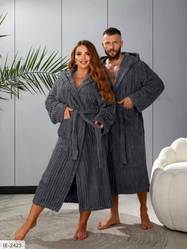 Халат IE-2425 модель 4409-37 Розмiри: 46-52 Тканина: мікрофібра (відмінно зберігає тепло, швидко вбирає вологу, дуже легка, ідеальна для використання після душу або ванни) Колір: графіт, ментол, Фуксія, бузковий, червоний, смарагдовий. Халат з капюшоном, широким поясом, що дозволяє легко регулювати посадку і глибокими кишенями, має приємну на дотик текстуру з вираженим рельєфним малюнком.