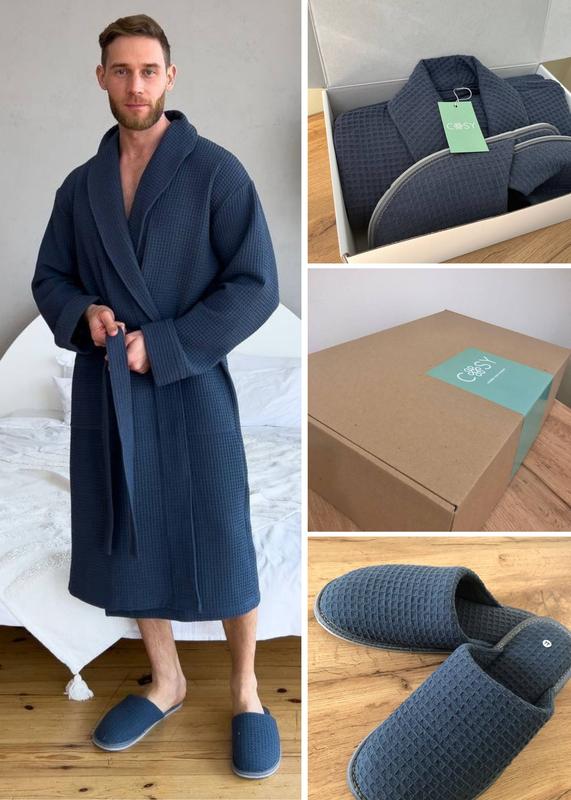 CZ_set9203 🎁Подарунковий набір для чоловіка. До складу набору входить: - халат вафельний - капці з вафельної тканини Елегантний чоловічий халат Сапфір із шалевим коміром виконаний з високоякісної вафельної тканини. Виготовлений з натуральної 100% бавовни, цей халат забезпечить комфортний відпочинок, що так необхідний після насиченого дня. Простий і зручний крій дозволяє почуватися максимально комфортно. Турецька якість тканини гарантує довговічність та зносостійкість виробу. • Колір: темно-синій • Матеріал: 100% бавовна, Туреччина • Щільність: 220 г/м2 • Розміри: S, M, L, XL, XXL Капці з вафельної тканини: Міцна підошва EVA - легка, має малу вагу. Не пропускає воду, не розтріскується згодом. Матеріал теплоізоляційний, еластичний, гігієнічний, надійний. • Капці 44 на розмір 42-43 (на стопу 28 см), довжина підошви 30 см • Капці 42 на розмір 40-41 (на стопу 27 см), довжина підошви 29 см Рекомендації щодо догляду: ❗️ Тканина не декатована, після прання дає усадку 5-6% (6-7 см). При першій примірці халат повинен бути вільний, він не повинен бути по фігурі і ідеально сидіти. ✅Правила догляду прості: 1. Прати у холодній воді не більше 40 градусів (рекомендована 30 градусів), на малих обертах 400. Не використовувати відбілювачі. 2. Природне сушіння. Не сушити в барабані. Рекомендується трохи розтягнути виріб під час сушіння 3. Прасувати при високих температурах до 200°С (режим бавовна) з паром. Після прання вафельні клітини збираються, але після висихання і прасування вони розходяться. Вся інформація щодо догляду за виробом вказана на бірці. Капці: 1. Рекомендовано використовувати тільки ручне прання. 2. Капці краще не віджимати, а дати воді стекти і просушити їх потім на рівній поверхні.
