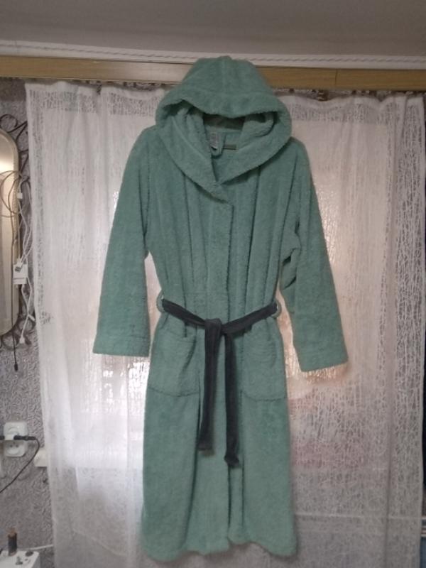 размер примерный, на бирке написан smal..цвет ментол,очень теплый, толстый, мягкий и уютный,ает карманы и капюшон,стан хорош, с недостатками на правом рукаве прожжены как от искри сигарет,одная насквозь другие по поверхности штук 6, нев загрязнения... другому рукаве нев.загрязнение кромки рукава, это все...шел без пояса- добавлению в комплект нежидкий.. пог 61 см поб 63 см замеры по спинке рукав 61 см плечи 52 см длина 113 см
