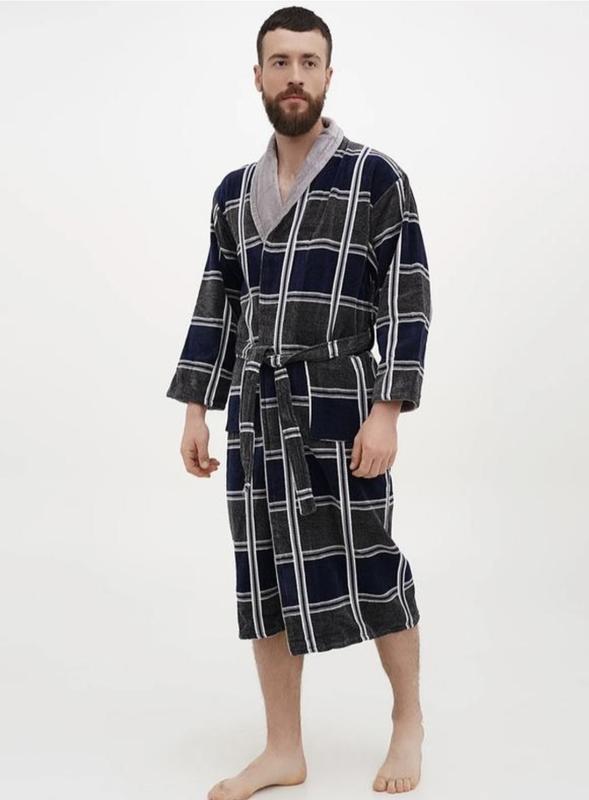 Натуральний чоловічий халат з коміром на запах в клітинку 9503-01