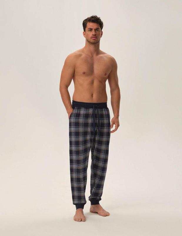 Піжамні штани чоловічі для дому та відпочинку HENDERSON 42457 HONOR 3 Чоловічі штани для сну з м'якої бавовняної фланелі в карту. Еластичний пояс і куліска для регулювання кола, зручні кишені на стегнах, штанини оброблені рантами. Склад: 100% бавовняна фланель. Штани Honor ідеально підходять як піжамні штани в холодні ночі. Темно-синій картатий візерунок підкреслює їх класичний характер. Зручні манжети внизу штанин запобігають скочуванню штанів Honor. Зручний еластичний пояс добре утримує їх на місці, а в глибокі кишені помістяться всілякі дрібні предмети. Штани Honor виготовлені з приємної тканої бавовни. 100% ткана бавовна темно-синя карта шнурок на талії