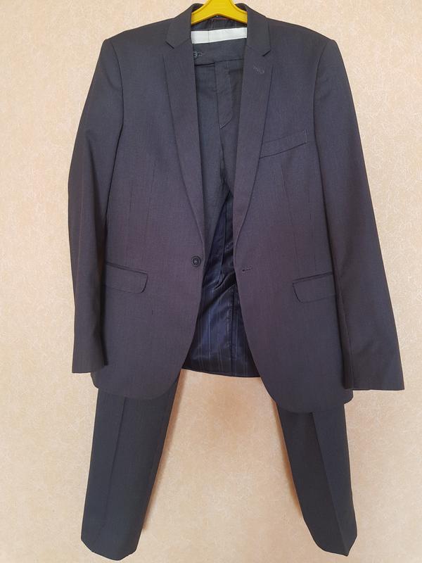 колір Графіт, в ідеальному стані, майже новий. На зріст 170 см. Штани: довжина 102, пояс 39, низ 18; піджак: довжина 75, рукава 64, плечі 44 см.