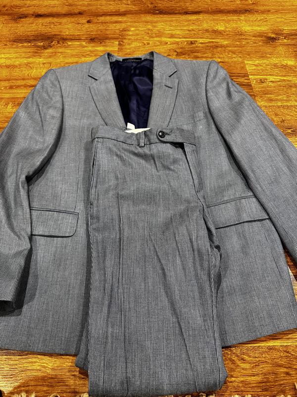 Продам в костюм, стан на фото. Він синій в дрібну білу полоску. Нижній ґудзик треба підшити. Піджак: Довжина - 75 см Ширина - 52 см Рукав - 62 см Штани: Довжина - 101 см Пояс - 46 см