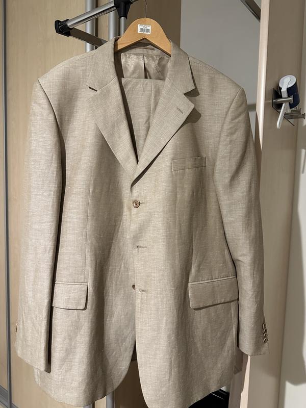 Піджак (обʼєм в півоберта) Груди 60 см Стегна 64 см Довжина по спині 87 см Рукав 70 см Брюки Талія півоберта 54 см Довжина 115 см
