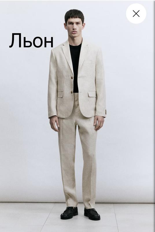 Стильний льляний костюм H&M. Красивого світло бежевого кольору. В ідеальному стані без дефектів. Розмір піджак 52, штани 46. Орієнтуйтесь по замірах. Гарно лягає на М. Тканина 100% льон. Заміри: Піджак- плечі 46см, груди 52см, талія 48см, низ 55см, рукав 65см, довжина від плеча 73см, довжина по спині 74см. Штани- пояс 41см, бедра 50см, посадка 26см, довжина по боковому шву 100см, по внутрішньому шву 74см, штанина верх 30см, низ 17см