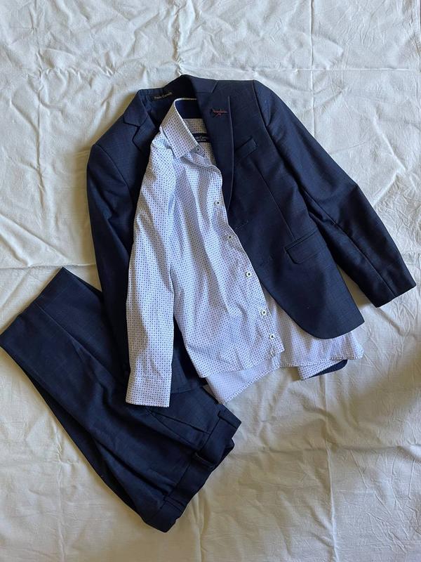 Елегантний темно-синього кольору в клітинку костюм для хлопчика. Вік - приблизно на 8 років. Піджак - розмір 28. Речі в ідеальному стані. Не зававжає рухам дитині, приємний на дотик, ніде не колиться. В подарунок віддамо підтяжки. Можлива примірка в залежності від вашого міста знаходження. Можливий торг.