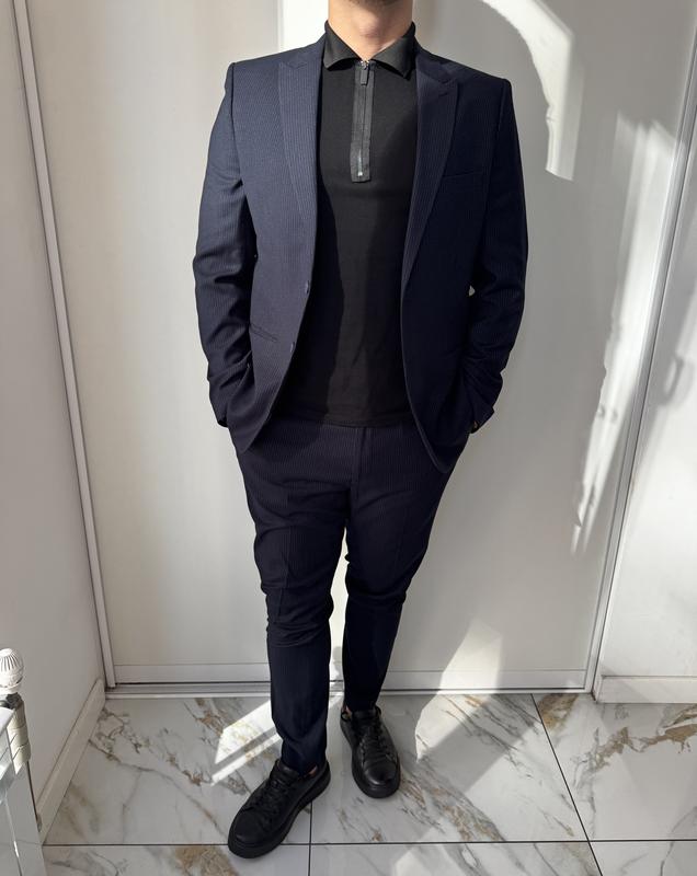 Стан новий ,вдягав два рази дуже крутий класичний костюм гарно виглядає розмір брюк 33/34 а піджак 44 на вагу 85-90 кг а на зріст приблизно 180-185 см Темно-синій костюм