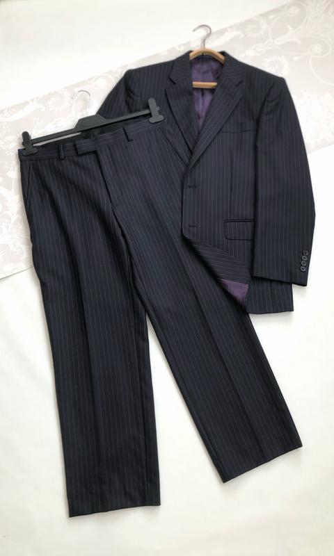 Состояние отличное.100% шерсть.Цвет трудно определить темно синий или черный. Брюки: Пот-43 Поб -54 Высота посадки-32/35 Длина-68 внутренний шов Длина-95,5 внешний шов Ширина:: Бедро-30,5 Голень-24 Низ-22,7 Пиджак: Пог-51 Пот-49 Поб-51 Плечи-45,5 Рукав-61 Длина-74.