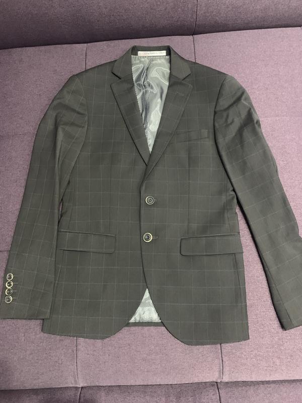 Чоловічий костюм на підлітка 15-17 років елітна якість, виробництво Україна-Німеччина, в ідеальному стані, одягнений кілька разів .Легка натуральна тканина чорно-сірого кольору в дрібну клітку, тканина не скло на вигляд матова, не блискуча. Піджак на гудзики, ззаду 2 шліци, спереду-2 кишені. -2внутрішніх, застібка металева петля + гудзик і блискавка. Піджак: довжина по спині-69см, плече-14см, рукав-61 см, ширина під руками-45см, низ-45см. Брюки-довжина -86 см, пояс-80 см, попа-88 -92см, ляшка-25см, коліно-20см, низ-16см.Ціна нового вище в 2 рази