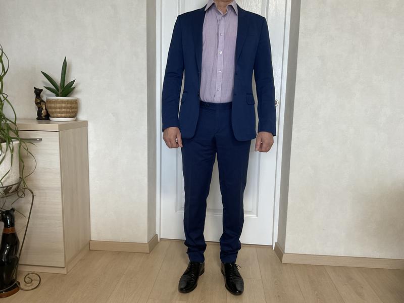 Костюм чоловічий синього кольору, фірма «Арбер», р.46-48 український. Пошитий по гарним лекалам, дуже гарно сідає на фігурі. Заміри штанів: ПОТ 42 см., довжина 105 см.(є запас); піджак: від шва до шва (під пахвами) 48 см., довжина плеча 14 см., довжина рукава (по верхньому краю) 64 см., довжина піджака 71 см. Стан відмінний.