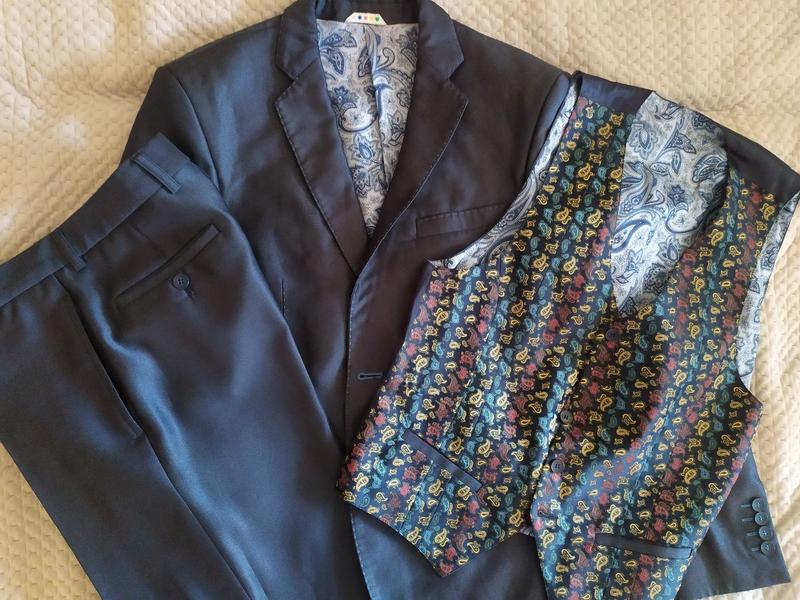 Чоловічий костюм, шитий на замовлення, одягнений пару разів, стан ідеальний, розмір С-М У набір входять штани, желетка, та піджак. Колір темно синій. Довжина штанів - 102см. Напів обхват стегон - 40 див. напів обх. літки-29 див. Довжина піджака - 67 див. напів обхват грудей - 48 см. довжина рукава -62 див.