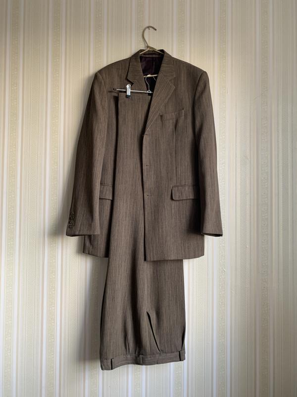 Немнущаяся ткань, выглядит идеально. Пиджак: карман на груди, два кармана по бокам и один внутри. Брюки: два кармана вверху по бокам и один сзади на пуговице. Размер указан 50 (верх) и 54 (низ) Пиджак: Плечи 49 см Длина 89 см Рукав 68 см Ширина от подмышки до подмышки в застегнутом виде 55 см Низ в ПО 50 см Брюки: Длина 109 см Ширина внизу 24 см ПОТ 46 см
