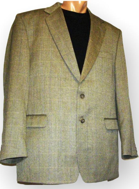 Піджак GREN, імпортний-Португалія, твідовий, сір-зелений цвіт у витончену карту. Тканина в ялинку, з вовни з додаванням поліестеру. Розмір 58, довжина по спинці 83 см, довжина рукава 66 див. Об'єм по талії — 128 см. Обсяг грудей — 1232 див. Шліц-ні.