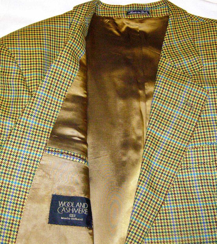 Пиджак WOOL AND CASHMERE, от Mario Bellucci, импортный- Италия, пошит из высококачественной шерсти с добавлением 20% кашемира, оригинального рисунка с преобладанием желто- горчичных тонов в цвете ткани. Размер 54-56, длина по спинке 82 см, длина рукава 66 см. Объем по талии- 116 см. Объем груди- 126 см. Шлиц- 2 шт.