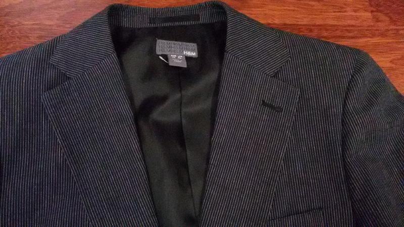 Чоловічій піджак H&M, стан новоі речі, (не носився), розмір повний 46, виробництво Кітай, склад: 53% льон, 47% бавовна, колір темно сірий в тоненьку смужку, кармани ще зашиті, 2 гудзика запасних Ширина плечей - 44,5 см Довжина рукава - 75,5 см від ворота, 62,5 см від плеча Ширина під пахвами - 50,5 см Ширина в таліі- 45,5 см Довжина по спині - 73 см