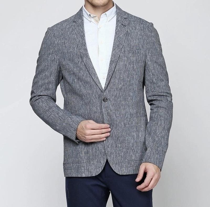 П: Стильный мужской пиджак, серого цвета в мелкую белую полоску, на двух пуговицах, без подкладки Все вещи новые и с оригинальными бирками. Дополнительные фото, фото на себе и замеры скинем в частные уведомления. 30-37527