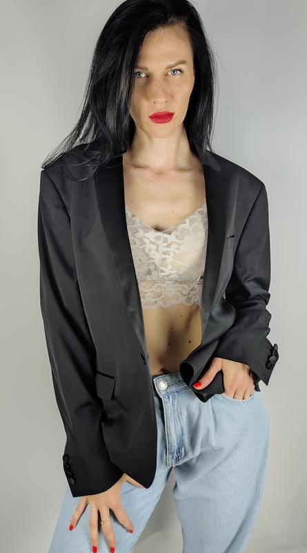 Класичний піджак з атласним коміром, обробкою на кишенях і атласними гудзиками. Буде стильно виглядати з корсетом і акцентним ременем. Стан нової речі (шліца і зашиті кишені). Розмір по бірці 44 R Заміри: плечі 49 см, рукав 66 см, ПОГ 56 см, довжина 76 см, ПОС 57 см