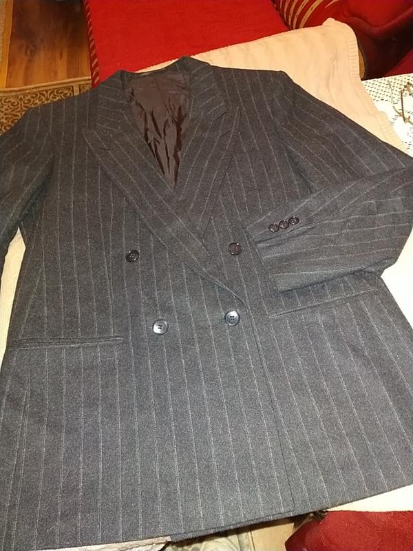 сіро-синій в смужку, 45% вовни, 55% травира (не горюча тканина (, захист від попелу від сигарет), підплічники, застібається на чоловіків і жінок, без шліц. добре тримає форму. Довжина 76см. довжина рукава 59см .Плечо 16см.