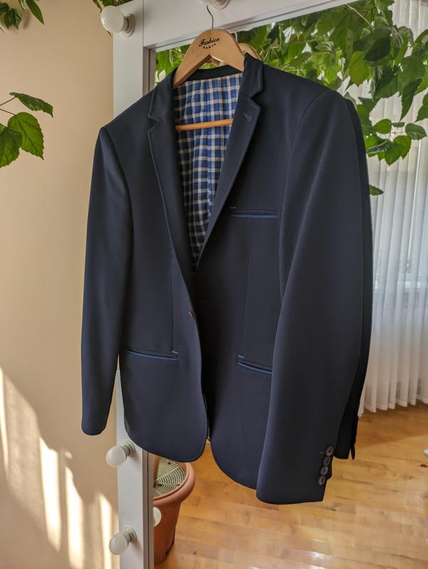мужской пиджак пике на одну пуговицу гарна,текстурована тканина состояние идеально производитель Турция размер подойдет на М (может быть на планомендующий S) насыщенный синий цвет, на фото загорает