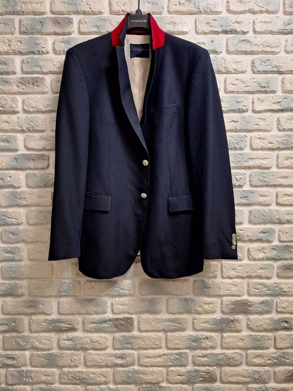 Tommy Hilfiger Плечи – 48см Плечо – 14см Длина рукава – 68см Спина, под рукавами – 57см Спина, талия - 52см Длина – 76см Есть запасные пуговицы, в бумажном конверте, последнее фото Tемно - синий 50% cotton 31% polyester 16% viscose 3% elastane