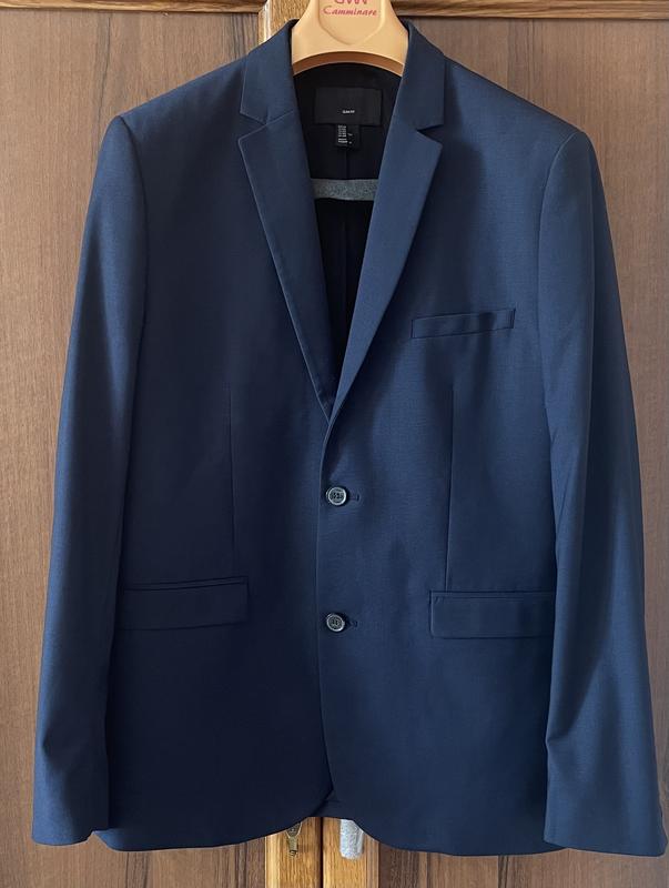 Піджак в ідеальному стані, одягнений раз. Темно синій колір. Кишені ще зашиті. Бренд: H&M Розмір: EU54 Склад тканини: 81% поліестр, 17% віскоза, 2% еластан