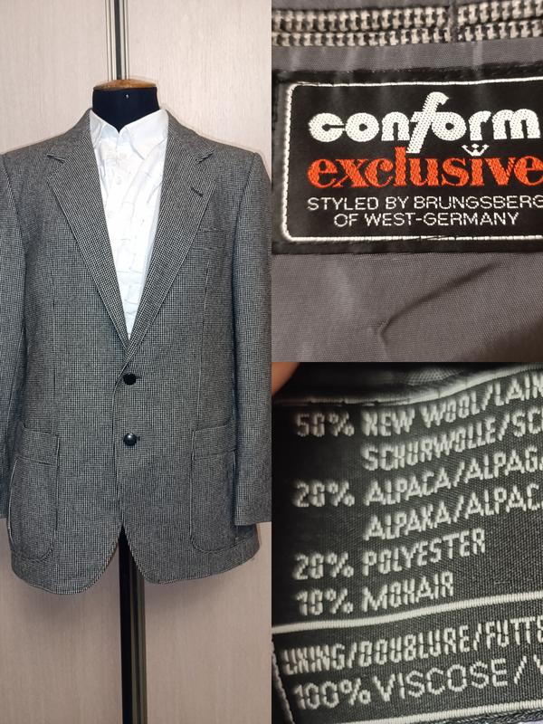 вовняний піджак виробництва Західної Німеччини. фасон класичний і актуальний і сьогодні. 50% шерсть 20% альпака 10% мохер тканина м'яка та приємна на дотик. з боків накладні кишені виготовлені з розширенням. всередині кишенька з обох боків. ззаду два розрізи довжина 75 см довжина рукава 62 см плечі 45,5 см НОГ 55 см ПОТ 51см