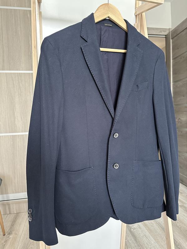 Піджак синій чоловічий Massimo dutti розмір eur46. Матеріал ззовні 100% віскоза, підкладка 100%бавовна Заміри: Довжина по спині 72см, довжина від плеча 67см, довжина рукава 62 см, ширина плечей 50см, ширина грудей 37см, талія 43см