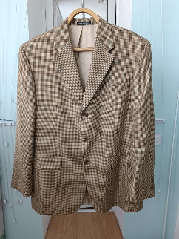 Чоловічий піджак відомого американського преміум бренду бежево-коричневого кольору прямого покрою з не великим розрізом внизу в маленьку гусячу лапку в ідеальному стані ні одного дефекта. Стан нової речі. Мабуть він не носився. Рукава і ворот не замаслені, не витерті. Слідів носіння немає. На фото колір більш сірий, а насправді, бежево-коричневий. Розмір Xl-XXL. Плечі 51см. Рукав 66. ПОГ 58,5. ПОТ 57. ПОБ 59. Довжина 80,5.