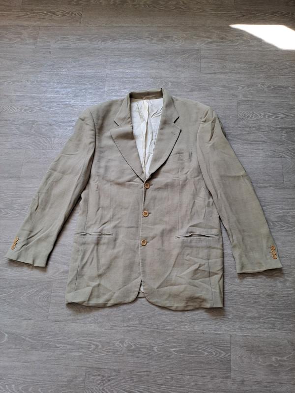 Легендарний joop. В цілому стан чудовий, ззаду є трохи світліша полоска через те, що був складений ( на останньому фото). Можна підфарбувати, можна на перешивку. 15% шовк. Довжина 80см., плечі 51см., рукав 65см., пог 57см., пот 51см., по низу 55см.