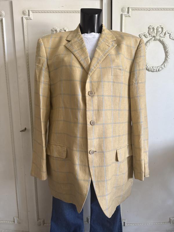 Якісний чоловічий піджак з льону від преміального бренда City Time. Склад:льон-100/. Чудова клітинка на блідео-жовтому фоні., на підкладці. Розмір по бірці-56, але треба орієнтуватись по замір ах. Заміри: довжина-84 см, ПОГ-60 см, ПОТ—56 см, ПОБ-62 см, рукав-66 см, ширина в плечах-50 см. Стан ідеальний.