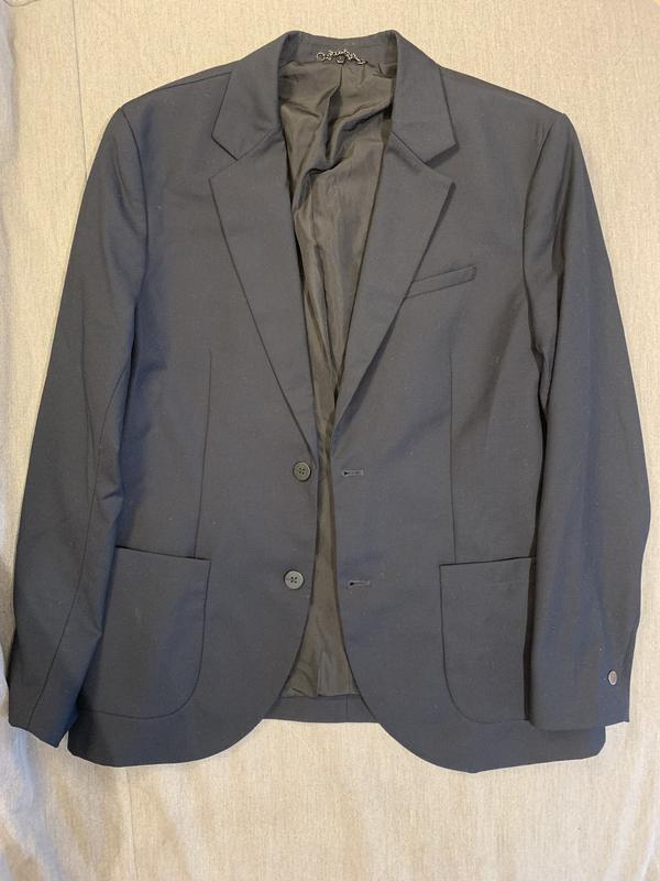 Піджак темно-синього кольору Тканина преміум якості Стан нового,одягнений один раз До нього застібався капюшон,але його загубили Розмір L Довжина 76см ПОГ 43см ПОТ 51см Рукав від плеча 65см