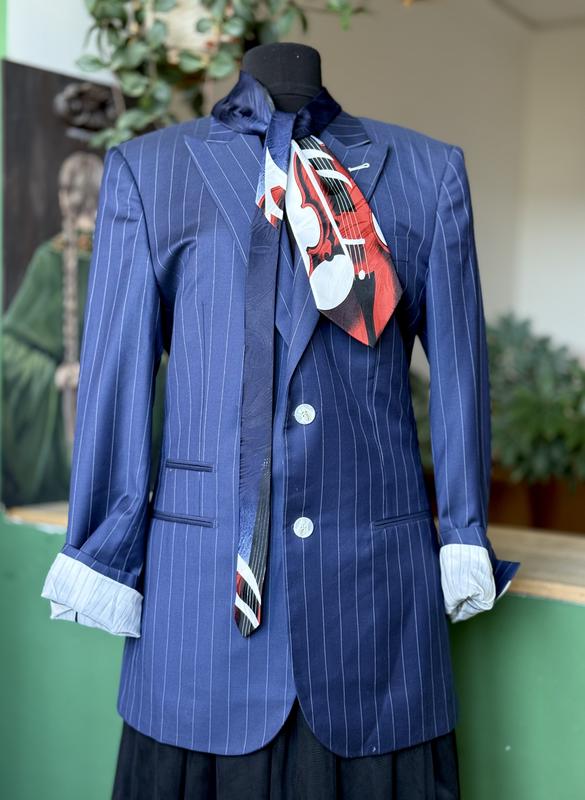 Loro Piana Піджак синього кольору з білими ґудзиками, як цікавий акцент, підкладка атласна з грайливим принтом Ing. Loro Piana & C. – компанія Loro Piana (Італія), відома як один із найкращих світових виробників високоякісної вовни та кашеміру. • Fabric made in Italy – тканина вироблена в Італії (це важливий знак якості). • Tasmanian® – фірмова лінія Loro Piana. Це легка, але дуже міцна тканина з тонкої австралійської вовни мериноса. Вона відома гарною «дихаючою» структурою, підходить для костюмів на теплі пори року. • Super 150’s Wool – маркування тонкощі вовни. «Super 150’s» означає, що використовувалося надзвичайно тонке волокно (приблизно 16 мікрон), що робить тканину дуже м’якою, елегантною та дорогою. Розмір в грудях 110, в плечах 45, довжина 80, рукав 65