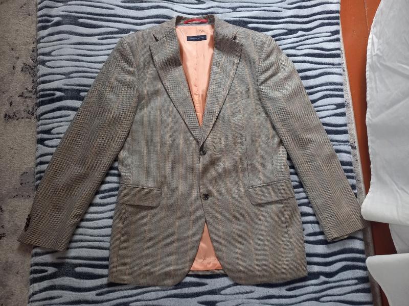 Чоловічий брендовий класичний піджак жакет у карту Tommy Hilfiger, 52 розмір. Оригінал. Не ношен (сток). Гарно лягає по фігурі. Суперякість. Натуральний склад — вовна та шовк. Плечі — 48 см. У грудях — 58 см. В талії — 53 см. Довжина по спинці — 79 см. Рукав — 66 см. Низ — 55 см. Пересилаю.