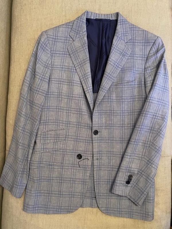 Мужской легкий пиджак Patrick Hellmann. Состояние идеальное кроме пуговиц {на фото видно}. Размер 47-48 {M}. Две пуговицы на рукавах имеют отколотые части. Одна из пуговиц впереди пиджака оторвана {но имеется в наличии, нужно только пришить}, одна с отколотой частью. Плечи - 47 см Рукав - 63 см Под рукавами - 50 см Длина - 74 см