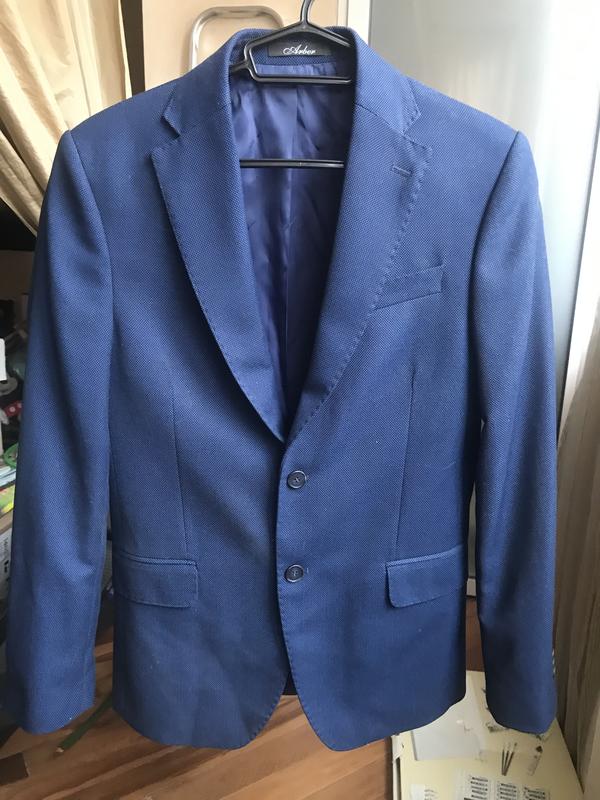 Приталений , з ідеальною посадкою, піджак, красивого синього відтінку ( колір не однотонний, а фактурний-в дрібний ромб). Одягнений -1 раз . Український виробник, тканина 84% поліестер+16% віскоза з оздоблювальною строчкою бортів, підкладка синя оброблена вузьким кантрі і декоративною строчкою блакитно-сірого кольору..Ззаду дві шліци з боків, за типом «клубний піджак», що ще більше підкреслює силует. Розмір на етикетці 176/92/80 Довжина плеча-17 см, довжина рукава-64,5 см,ширина спини по пахв-55 см, довжина по спині-75 див. Можна ідеально поєднувати зі світлими брюками , а можна і з темними.Виглядає добре і в повсякденних, так в урочистих комплектах.