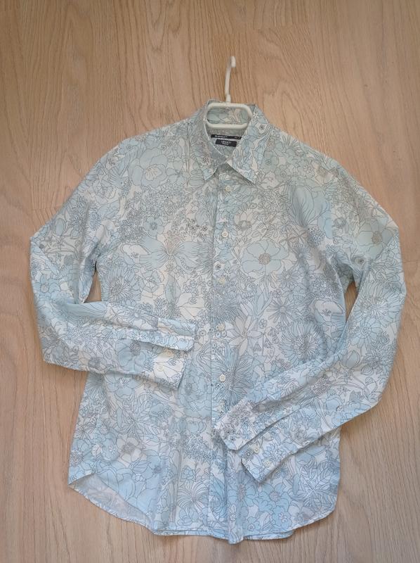 Красивая и стильная мужская рубашка отличного качества и оригинальной расцветки в принт «цветы». Цветовая гамма – белый и серо-голубой цвета. Размер указан «М». Бренд - «Celio». Производитель –Тунис. Состав: 100 % хлопок. Замеры следующие: 1.Ширина в плечах –45 см. 2. Ширина по спине ( от подмышки до подмышки )- 54 см. 3. Длина рукава по внешнему шву- 64 см. 4. Длина рукава по внутр.шву - 51 см. 5.Общая длина (от плеча) - 73 см. 6. Воротник – 39 см.