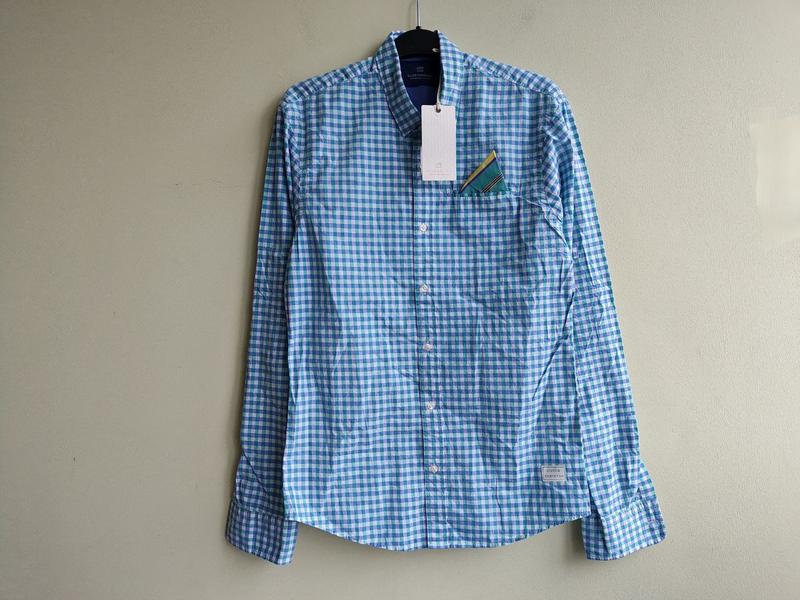 Нюанс : плямка на кишені!!! Чоловіча сорочка в клітинку Scotch&Soda Amsterdam Couture Колір: синій/бірюзовий/білий Зроблено в Індії Стиль: 1601. 02. 20043 130717 Розмір : S Склад: 100% бавовна Вимірювання: (1) пог-48,5 пот-45,5 низ-48 довжина-74,5 рукав -68,5 плечі+-45,5 Вимірювання можуть мати похибку +- 0,5см Вага: 200