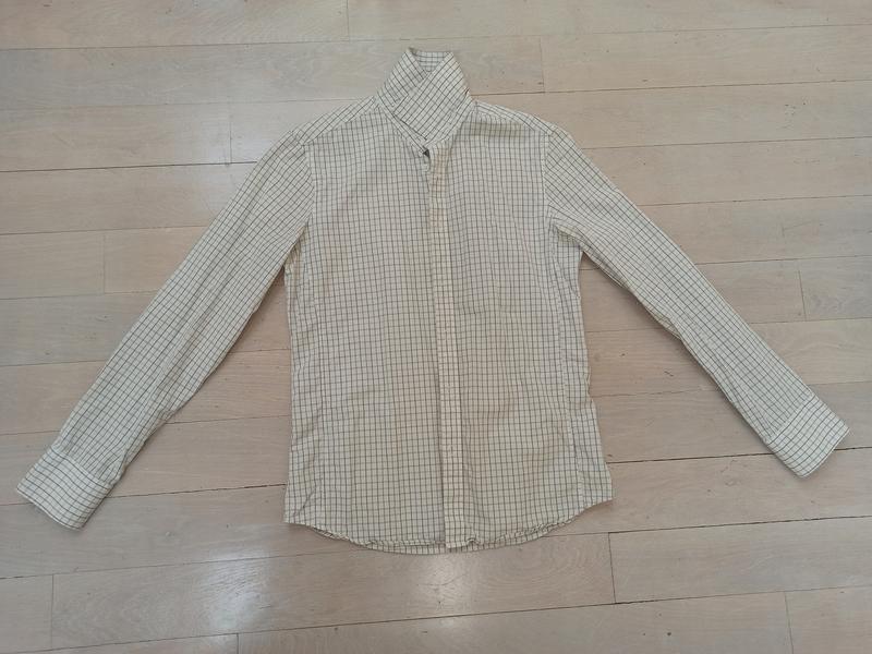 Легка біла сорочка в клітинку від відомого бренду. По замірам схоже на M, але по обхвату в грудях це S