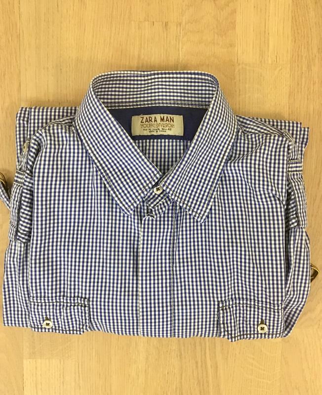 Чоловіча сорочка сорочка Zara, оригінал з Італії. Вказаний розмір XL, 42; але підійде на L, 40. Дуже стильна дрібна синя клітинка, рукав на захід, з залізними пряжками. Заміри: Ширина по спині (від рукавів) 45 см Довжина рукава 62 см Довжина по спині 75 см За додатковими фотографіями і вимірами - пишіть. Вдалих покупок!